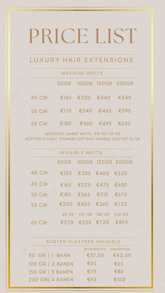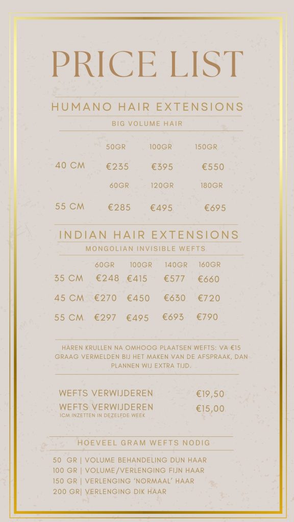 We plannen altijd eerst een vrijblijvende intake, zodat de wensen besproken kunnen worden en we jouw haar goed kunnen bekijken. Dan kunnen we een passend advies geven over de hoeveelheid wefts die nodig zijn en een kleuradvies geven. Daarom is het altijd lastig om te zeggen hoeveel het nou precies kost, zonder iemand eerst gezien te hebben.